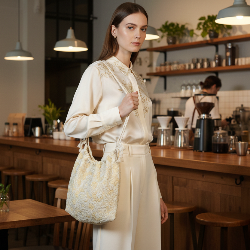 Carry a touch of nostalgia with this large drawstring bag, handcrafted from upcycled textiles. Fully lined and featuring a long adjustable strap, each one-of-a-kind piece blends vintage charm with modern, everyday style.