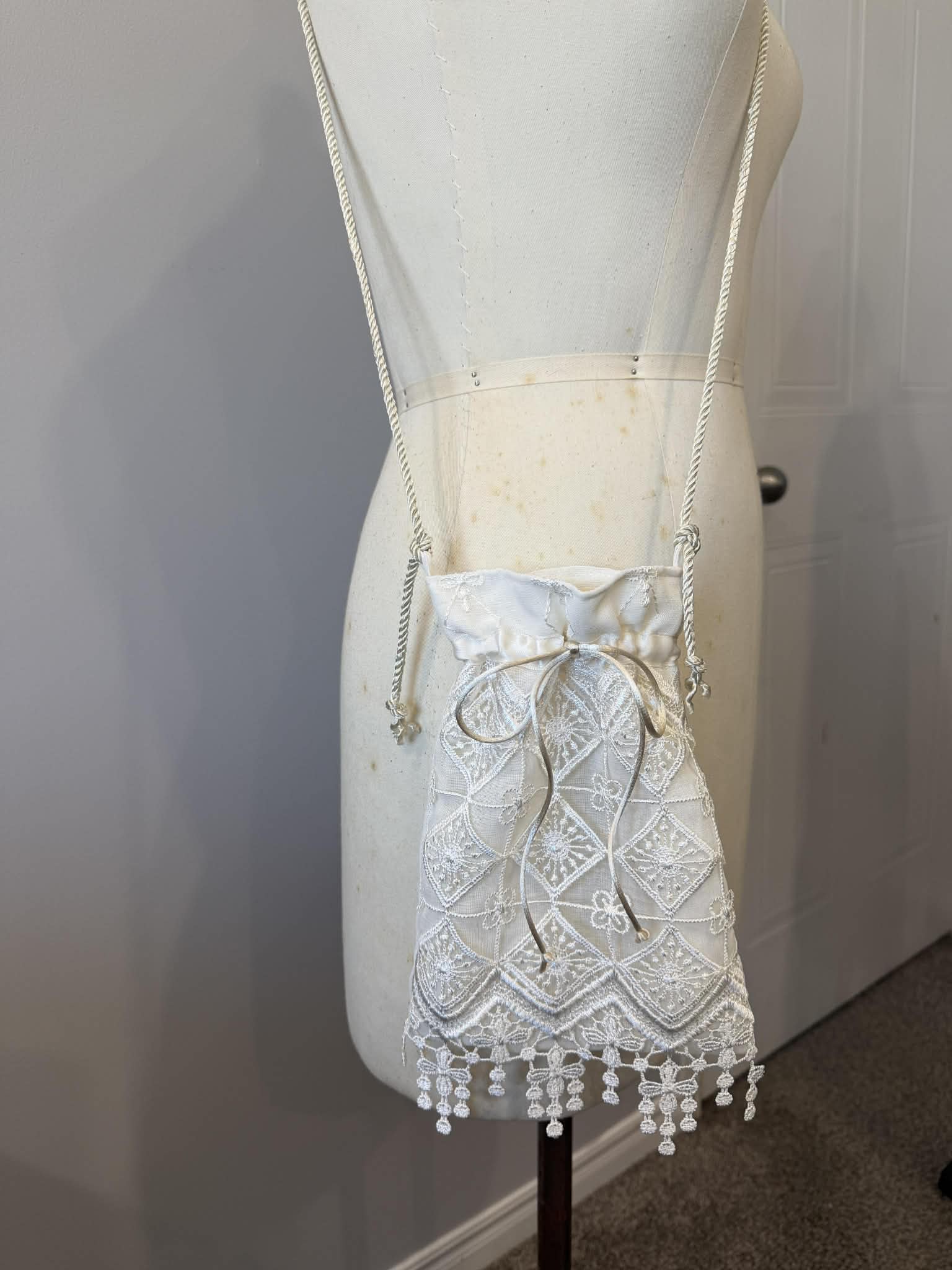 The Summer Verse Bag is handcrafted from vintage geometric embroidered curtains. This small upcycled bag features a long adjustable strap and drawstring closure, making it the perfect accessory to pair with the Summer Verse Lace Pant or a breezy sundress.