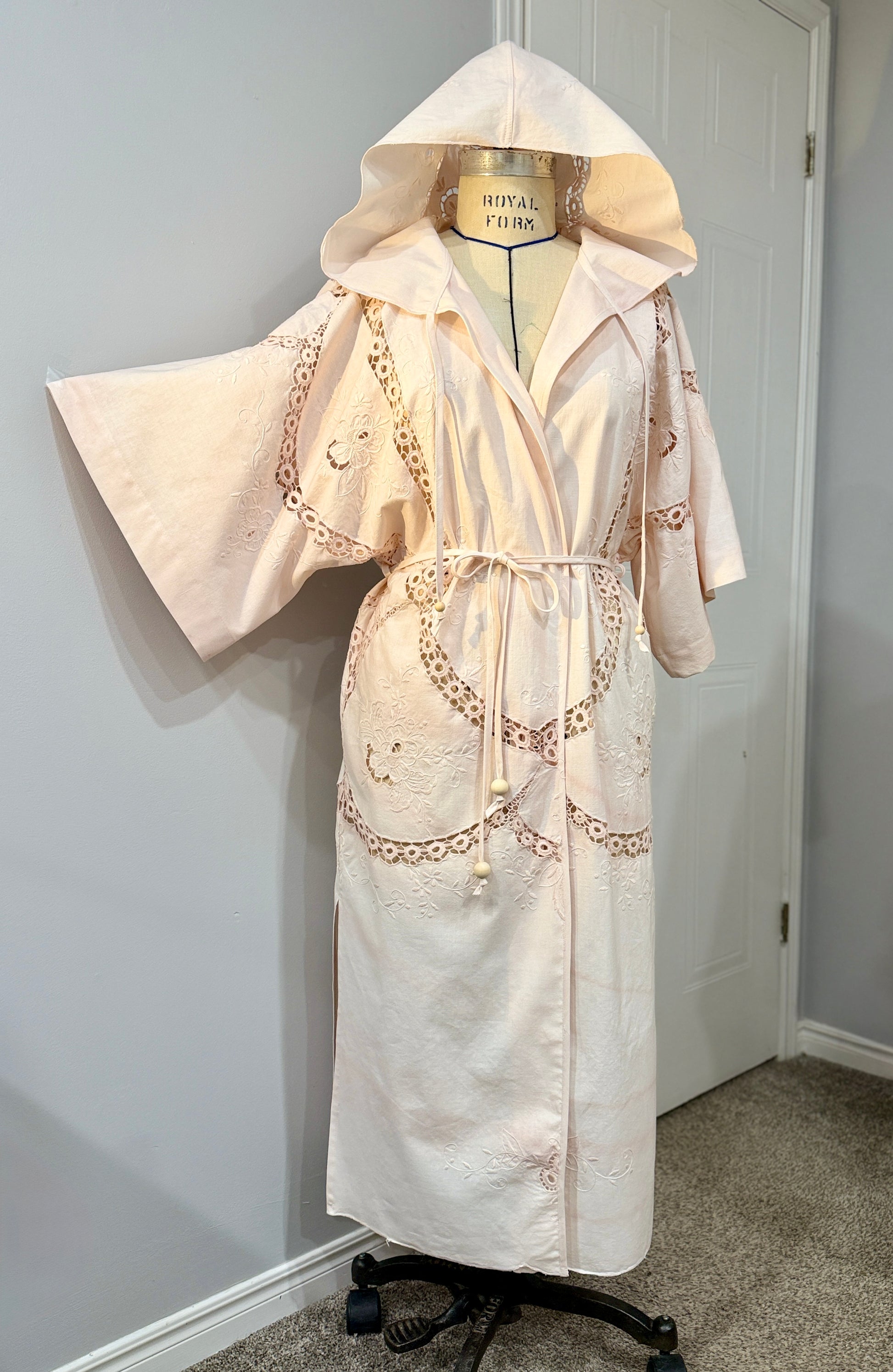 One-of-one hooded duster coat made from reclaimed vintage lace and naturally avocado dyed cotton. A romantic heirloom layer from the Quiet Heirlooms collection by Second Verse.